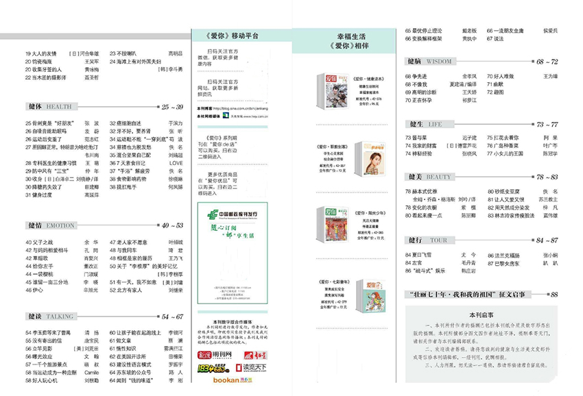 《愛你》雜志自創(chuàng)辦以來一直致力于探索和傳播情感、人際關系、婚姻、家庭和個人成長等領域的知識與經驗,旨在通過深入的報道和專業(yè)的指導,幫助讀者提高情感智慧,追求個人幸福和彼此間的深層溝通。該雜志以其深入研究和廣泛的內容,贏得了讀者的喜愛與信任。每期雜志都包含多個專題,涵蓋了情感心理學、人際交往、婚戀關系、親子教育、個人成長等方面的內容。通過深入的報道、專訪和案例分析,雜志為讀者提供了寶貴的經驗和建議。