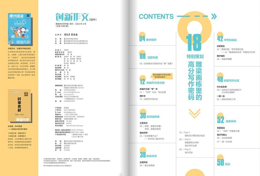 《創(chuàng)新作文》是一本專注于鼓勵(lì)和展示創(chuàng)新思維與文學(xué)創(chuàng)作的雜志。本雜志的目標(biāo)是挖掘各種文學(xué)形式中的創(chuàng)新元素,提供一個(gè)展示讀者作品的平臺(tái),促進(jìn)文學(xué)創(chuàng)作的交流和發(fā)展。該雜志內(nèi)容豐富多樣,涵蓋了散文、詩(shī)歌、小說、評(píng)論等多種文學(xué)形式。不僅如此,雜志也會(huì)特別關(guān)注一些新興的文學(xué)流派和風(fēng)格,如實(shí)驗(yàn)性文學(xué)、跨界文學(xué)等,為青年作家創(chuàng)作和發(fā)表提供更多可能性。