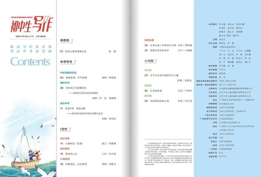 《初中生寫作》雜志是一個專門為初中生提供寫作指導和交流平臺的期刊。本雜志的宗旨是鼓勵和培養(yǎng)初中生的寫作能力,提供優(yōu)質(zhì)的寫作資源,為他們的成長和發(fā)展提供支持。雜志致力于為初中生提供具有啟發(fā)性和指導性的寫作文章。我們會邀請一些優(yōu)秀的作家、教育專家和編輯團隊,為讀者撰寫教學性強、內(nèi)容豐富的寫作文章。這些文章會涉及各種寫作形式,如小說、故事、詩歌、議論文等,力求引發(fā)讀者的興趣,并能從中學到寫作技巧和經(jīng)驗。