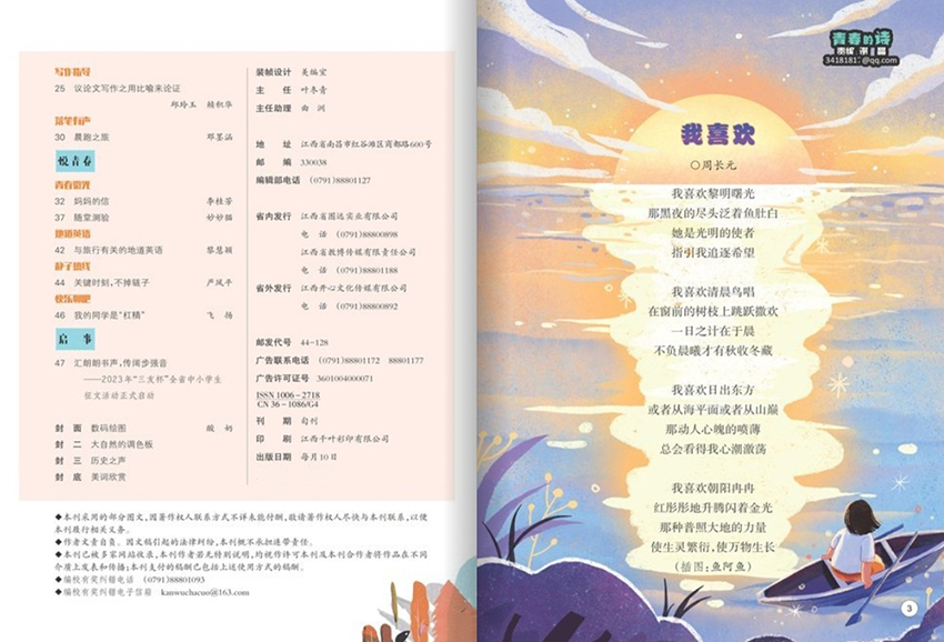 此外,該雜志還涉及情感與人際交往、文化藝術(shù)、社會(huì)實(shí)踐等方面的內(nèi)容,為初中生提供豐富多彩的閱讀體驗(yàn),拓展他們的視野和知識(shí)面,激發(fā)對(duì)生活的熱愛和對(duì)未來的向往。該雜志以其豐富多彩的內(nèi)容、獨(dú)特的學(xué)習(xí)角度和深入淺出的表達(dá)方式,深受廣大中學(xué)生和家長(zhǎng)的歡迎和喜愛。