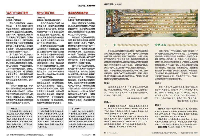 該雜志以鮮活的素材豐富了學(xué)生的知識儲備。在書中,不僅有經(jīng)典的詩詞歌賦,還有中國古代的寓言故事、民間傳說、歷史典故等等。這些素材不僅承載著豐富的文化內(nèi)涵,同時也可以引發(fā)學(xué)生對古代文化的探索和思考,拓寬他們的視野,提高了他們對東方文化的了解和感悟。通過接觸這些鮮活的素材,學(xué)生的文化品位和審美情趣也得到了培養(yǎng)和提升。