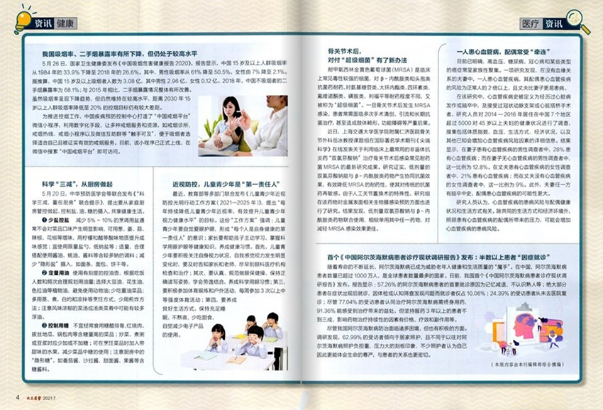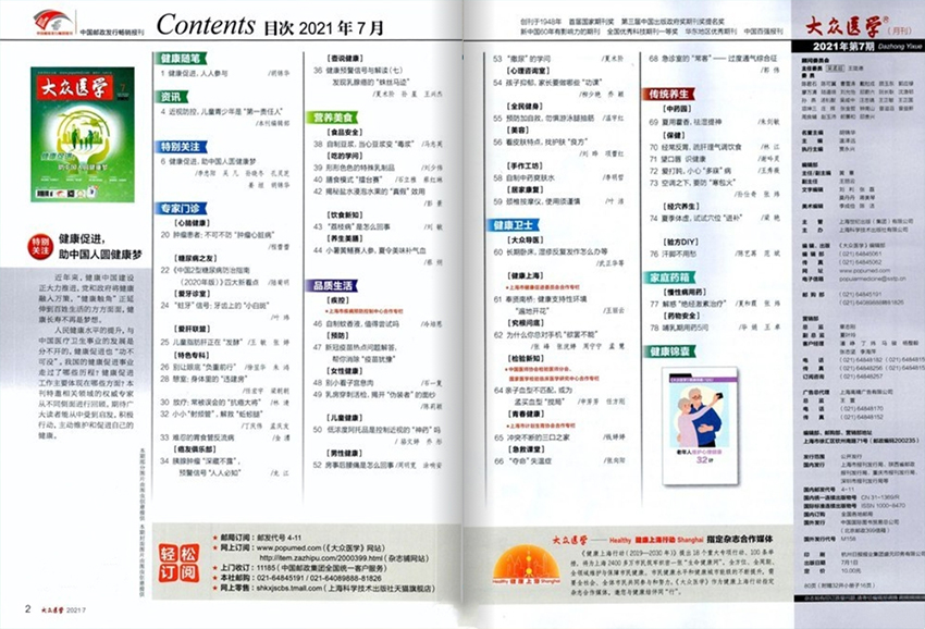 總之,該雜志是一本為普通讀者提供健康知識(shí)和資訊的權(quán)威期刊。通過(guò)準(zhǔn)確、易懂的內(nèi)容,讀者可以更好地了解和保護(hù)自己的健康,積極參與健康管理,過(guò)上更加充實(shí)、健康的生活。該雜志聘請(qǐng)了一批資深的醫(yī)學(xué)專(zhuān)家和科學(xué)記者,他們具有豐富的醫(yī)學(xué)背景知識(shí)和科學(xué)寫(xiě)作經(jīng)驗(yàn),確保雜志內(nèi)容的準(zhǔn)確性和權(quán)威性。雜志還定期與國(guó)內(nèi)外著名醫(yī)療機(jī)構(gòu)、研究機(jī)構(gòu)和專(zhuān)家合作,根據(jù)最新的醫(yī)學(xué)研究成果和臨床實(shí)踐,不斷更新和完善內(nèi)容,確保讀者獲得最新的醫(yī)學(xué)信息。