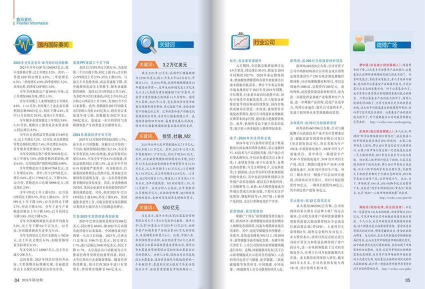 該雜志注重行業(yè)研究和個股分析,為讀者提供深入的行業(yè)洞察和個股推薦。通過對各個行業(yè)的研究和分析,讀者可以了解到不同行業(yè)的發(fā)展前景和投資機(jī)會。同時,本雜志還精選特定的個股進(jìn)行分析和推薦,幫助讀者發(fā)現(xiàn)潛在的投資價值。無論是重要經(jīng)濟(jì)指標(biāo)的發(fā)布、政府政策的調(diào)整還是國內(nèi)外重要事件的發(fā)生,本雜志都能第一時間報道和分析,幫助讀者及時掌握市場動態(tài)。