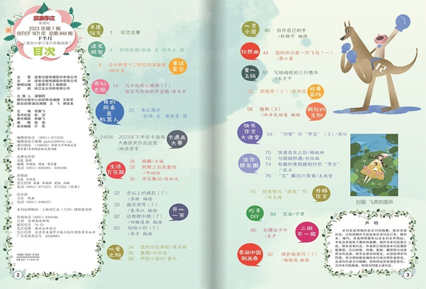 寫作指導(dǎo):專家學(xué)者和資深編輯團隊為讀者提供寫作技巧和指導(dǎo),包括構(gòu)思方法、寫作結(jié)構(gòu)、語言運用等方面的建議,幫助孩子們提高寫作水平。讀者互動:雜志鼓勵讀者參與互動,提供讀者來稿欣賞、互動交流的平臺,讓孩子們有機會展示自己的作品,分享寫作心得。趣味活動:定期舉辦各種有趣的寫作比賽、互動活動,為孩子們營造輕松愉快的學(xué)習(xí)氛圍,激發(fā)他們的寫作熱情。