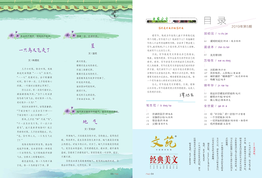 該雜志致力于挖掘和展現(xiàn)中華文化的深厚底蘊(yùn),通過(guò)對(duì)經(jīng)典美文的收錄與分享,讓更多的人感受到中文文字的魅力,理解中華優(yōu)秀傳統(tǒng)文化的內(nèi)涵。它不僅僅是一個(gè)文學(xué)作品的展示平臺(tái),更是一個(gè)文化傳承和交流的橋梁,連接著過(guò)去與現(xiàn)在,傳統(tǒng)與現(xiàn)代。除了文學(xué)作品的選載外,還會(huì)有針對(duì)性地收錄一些具有美學(xué)價(jià)值的非文學(xué)類(lèi)作品,如書(shū)法、繪畫(huà)等,從多角度展現(xiàn)美的形態(tài)。