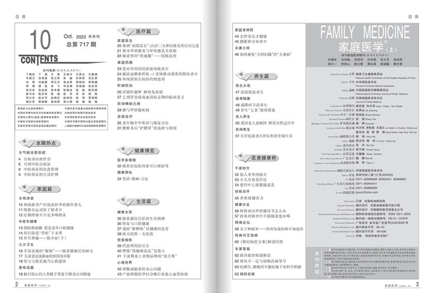 《家庭醫(yī)學(xué)》雜志每期均涵蓋家庭醫(yī)學(xué)領(lǐng)域的多個(gè)方面,包括但不限于:慢性病管理、健康教育、預(yù)防醫(yī)學(xué)、全科醫(yī)學(xué)、社區(qū)醫(yī)療、家庭醫(yī)生實(shí)踐、家庭醫(yī)療服務(wù)質(zhì)量評(píng)價(jià)等內(nèi)容。通過發(fā)表原創(chuàng)性研究論文、綜述、臨床實(shí)踐經(jīng)驗(yàn)、學(xué)術(shù)資訊等欄目,該雜志為廣大家庭醫(yī)生和相關(guān)醫(yī)務(wù)人員提供了一個(gè)學(xué)術(shù)交流的平臺(tái)。