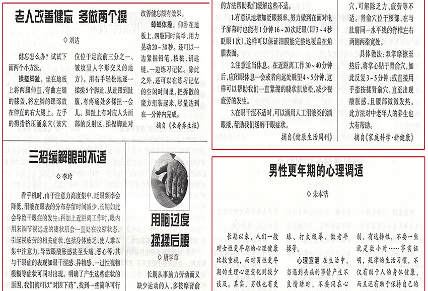 疾病預(yù)防與治療:該雜志關(guān)注常見疾病的預(yù)防和治療方法,提供相關(guān)的醫(yī)學(xué)知識和實用建議,幫助讀者更好地保護(hù)自己和家人的健康。中醫(yī)養(yǎng)生:雜志介紹中醫(yī)養(yǎng)生的理念和方法,包括中藥的應(yīng)用、針灸、推拿按摩等,幫助讀者了解中醫(yī)養(yǎng)生文化,掌握中醫(yī)養(yǎng)生的基本原則。健康故事:該雜志刊登一些真實的健康故事,分享一些克服疾病、重拾健康的個人經(jīng)歷,鼓勵讀者在面對困難時保持積極態(tài)度。