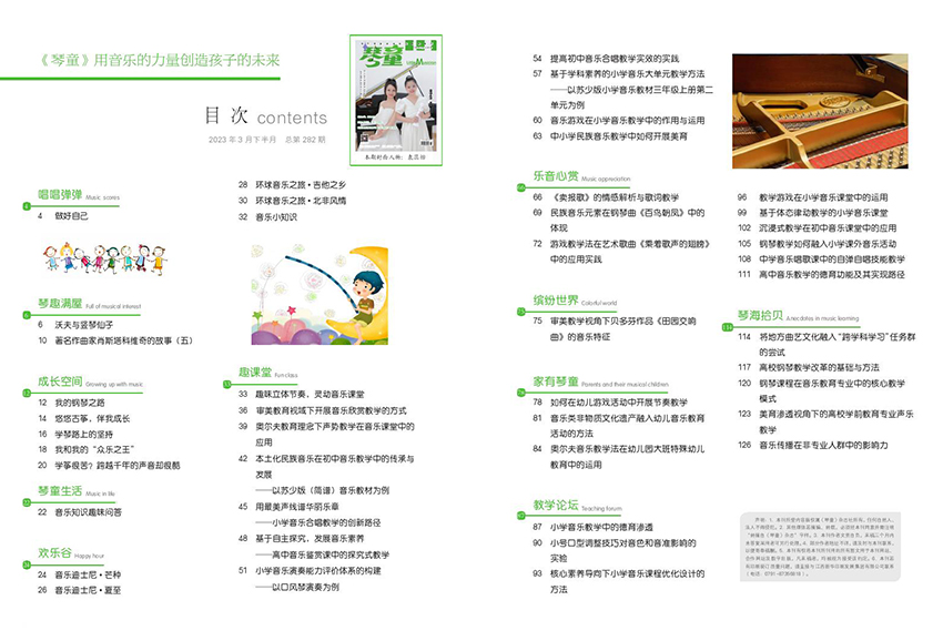 《琴童》雜志致力于為讀者呈現(xiàn)豐富多彩的音樂世界,幫助他們更好地理解和欣賞音樂的魅力。不論是專業(yè)音樂人還是普通愛好者,都可以在這里找到屬于自己的音樂樂園,與其他音樂愛好者一同分享和探索音樂的無窮魅力。旨在為廣大家長、教育工作者和音樂愛好者提供有益的音樂資訊、教學方法和兒童音樂活動的指導。本雜志匯集了來自音樂教育界的專家、教育學者和音樂家們的研究成果和實踐經(jīng)驗,力求為讀者呈現(xiàn)一份涵蓋多方面、內(nèi)容豐富的音樂教育刊物。