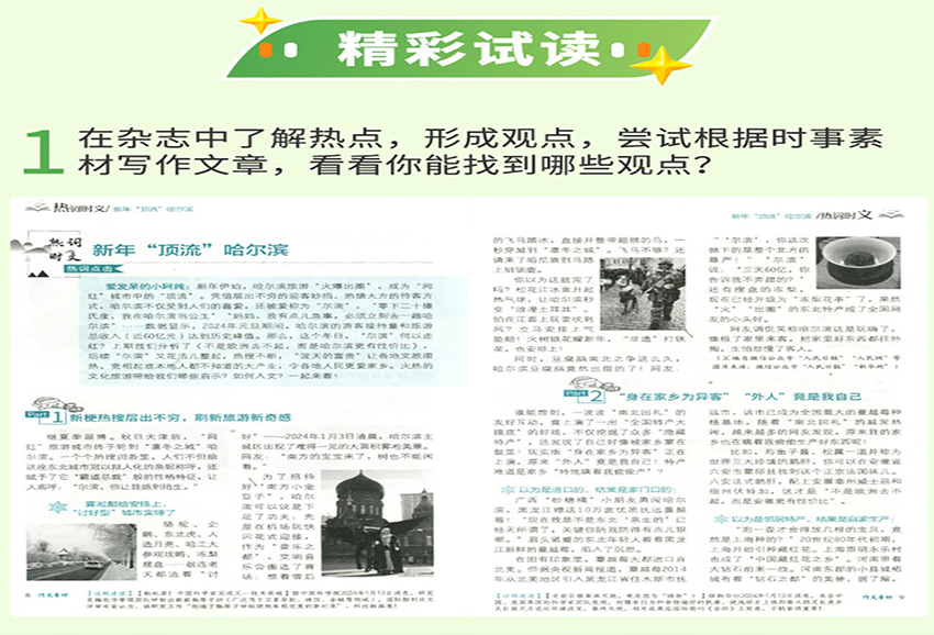 雜志關(guān)注當(dāng)下社會(huì)熱點(diǎn)事件,收錄獨(dú)家報(bào)道、人物專訪和社會(huì)觀點(diǎn)等素材。這些素材能夠?yàn)樽髡咛峁┥钊氲乃伎己头治?,激發(fā)他們對社會(huì)問題的關(guān)注和思考,從而寫出具有獨(dú)特觀點(diǎn)的作品。自然環(huán)境是作文創(chuàng)作的重要素材之一,該雜志致力于收集自然環(huán)境素材,包括山川河流、動(dòng)植物、天氣變化等。這些素材可以幫助作者描寫自然景色,給作品增添生動(dòng)感和藝術(shù)感。
