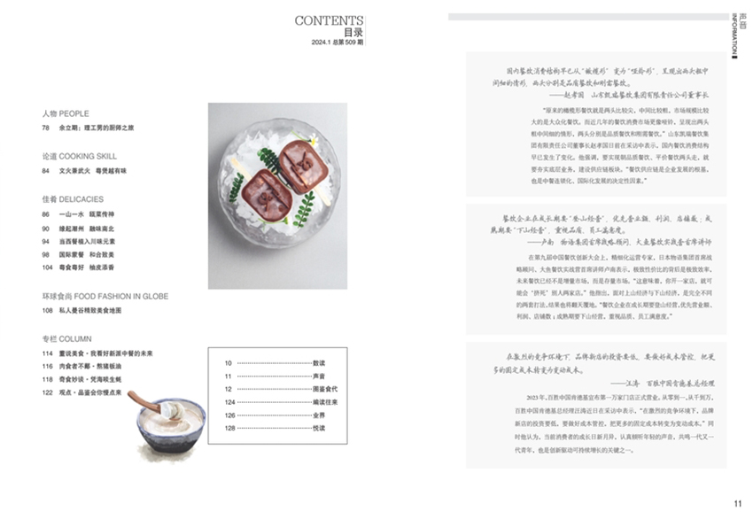 該雜志也會(huì)關(guān)注中國美食文化的傳承和創(chuàng)新,報(bào)道一些新興的美食趨勢(shì)和創(chuàng)意菜肴,讓讀者可以了解到中國美食的發(fā)展脈絡(luò)和未來走向。