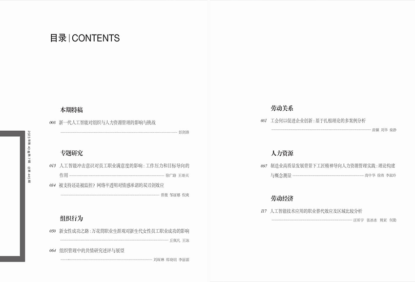 該雜志的內容涉及多個學科領域,包括但不限于人力資源管理、組織行為學、企業(yè)戰(zhàn)略管理、員工培訓與開發(fā)、績效管理、薪酬體系設計與實施、職業(yè)生涯規(guī)劃與發(fā)展、勞動法律與政策等。雜志內容既關注理論研究的前沿進展,也注重實踐經驗的分享與借鑒,力求將學術研究與實踐應用相結合。