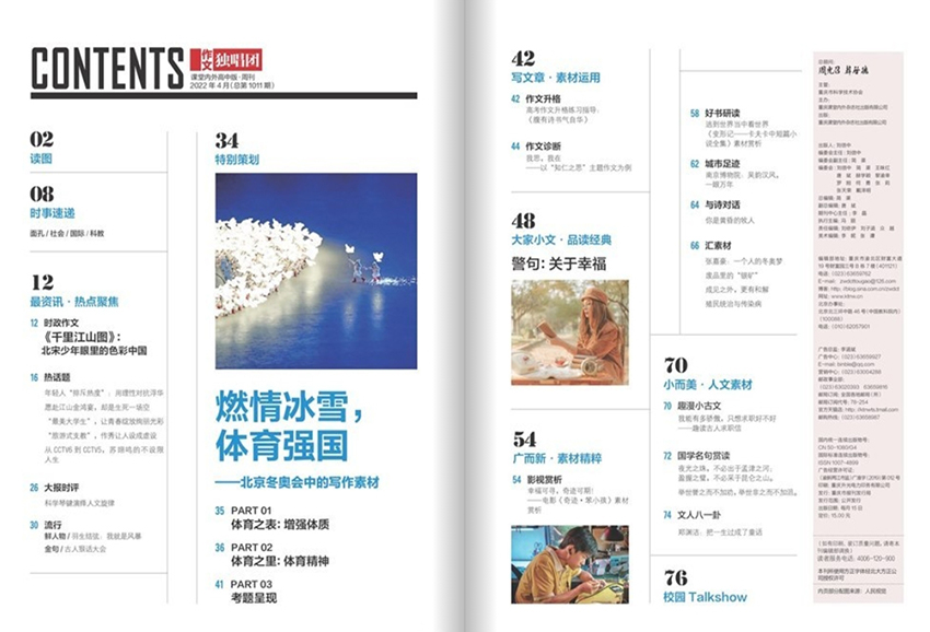 《作文獨(dú)唱團(tuán)》雜志以“獨(dú)特的聲音,獨(dú)特的表達(dá)”為辦刊宗旨,倡導(dǎo)每位學(xué)生都擁有獨(dú)特的寫作風(fēng)格和表達(dá)方式,鼓勵(lì)他們勇于展現(xiàn)自己的內(nèi)心世界。雜志注重作文內(nèi)容的多樣性和深度,旨在幫助讀者拓展視野,增長見識(shí),提升寫作能力。每期雜志包括散文、小說、詩歌等不同體裁的作品,涵蓋生活、人物、自然、歷史、科技等各種主題。作品內(nèi)容豐富多彩,既有真情實(shí)感的抒發(fā),也有奇思妙想的想象,展現(xiàn)了青少年獨(dú)特的審美觀和思維方式。