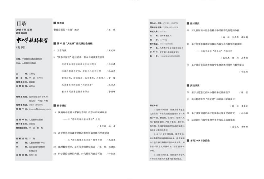 《中小學(xué)教材教學(xué)》雜志重點(diǎn)關(guān)注中小學(xué)教材的編寫和使用。它提供了最新的教材改革動態(tài)和教材編寫的理論與實踐,介紹了各地區(qū)各學(xué)科最新的教材教法。這為教師提供了一個了解和學(xué)習(xí)先進(jìn)教材的平臺,有助于他們更好地掌握和運(yùn)用教材,提高教學(xué)質(zhì)量。關(guān)注各種教育熱點(diǎn)和教育政策的討論與解讀。它通過深刻分析教育改革的意義和影響,為教師提供了對教育政策的深入理解和把握。同時,它也提供了各類教育研究的成果,啟發(fā)教師對教育問題的思考和研究。